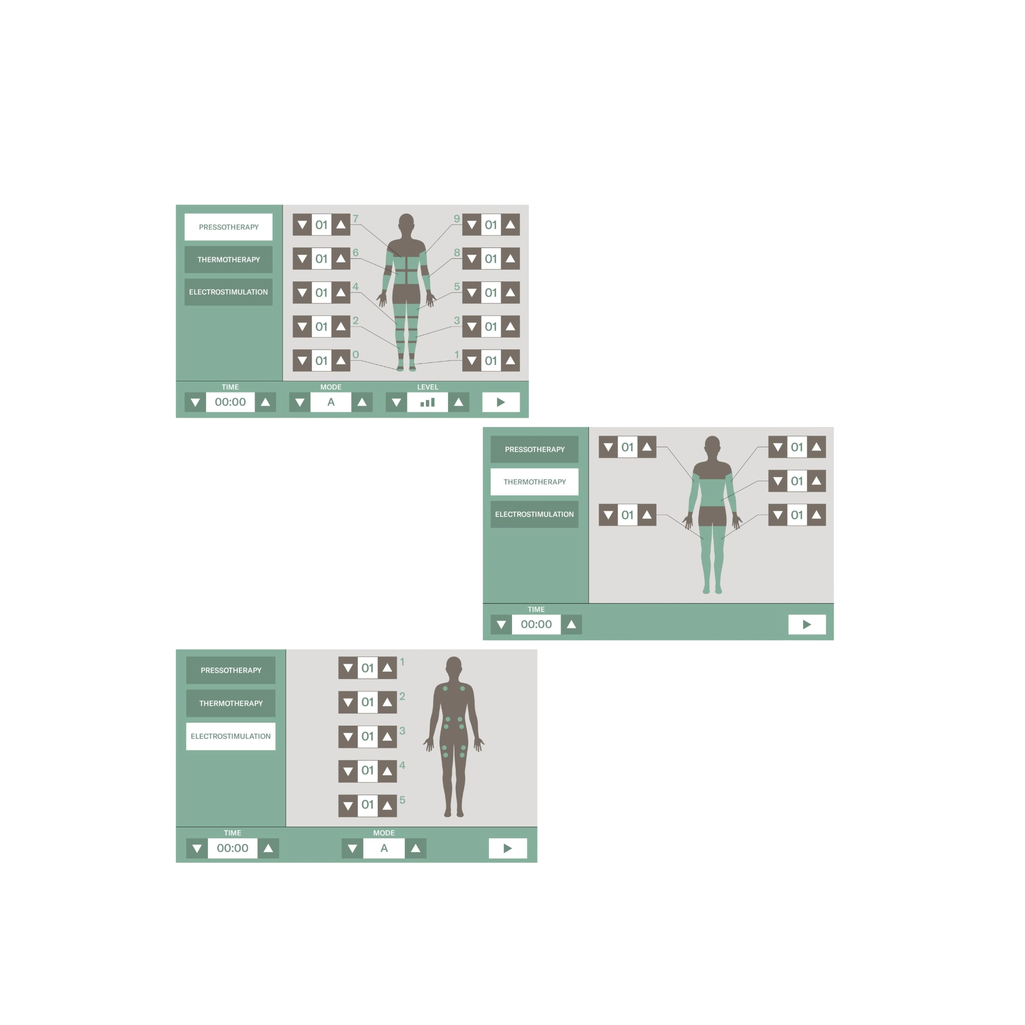 - Selezione di modalità preimpostata o configurazione manuale di tempo, pressione, temperatura e intensità EMS.